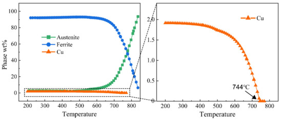 Figure 10 shows the results of the TEM analysis of the AW joint. SAED patterns present (100)B2 superlattice diffraction spots of two HAZ subregions (Figure 10b,e), which indicates the presence of B2 CRPs. However, the intensity of superlattice diffraction spots in the complete austenitizing zone is very weak. The dark field micrography reveals only a small amount of B2 CRPs in the complete austenitizing zone (Figure 10c) but a relatively high density of B2 CRPs in the partial austenitizing zone (Figure 10f). Compared with BM (Figure 3f), the number density of CRPs decreases obviously. By simulation calculation, the critical dissolution temperature of CRPs is 744 °C (Figure 11). The peak temperature of two HAZ subregions is higher than 744 °C. Therefore, the dissolution of CRPs is inevitable. Owing to the greater solubility of Cu in austenite rather than ferrite, the dissolution of CRPs should be controlled by the austenitizing degree. CRPs could fully dissolve during reheating in the complete austenitizing zone, whereas partial dissolution of CRPs occurs in the partial austenitizing zone. The presence of a few fine CRPs in the complete austenitizing zone implies the occurrence of reprecipitation. Unlike carbide precipitates (such as NbC and TiC) which start to precipitate within the austenite region [27]. CRPs do not reprecipitate in austenite, avoiding the formation of coarse particles. Moreover, the rapid heating rate also does not provide a long holding time at the high-temperature stage. Consequently, coarse CRPs are not observed in HAZ.