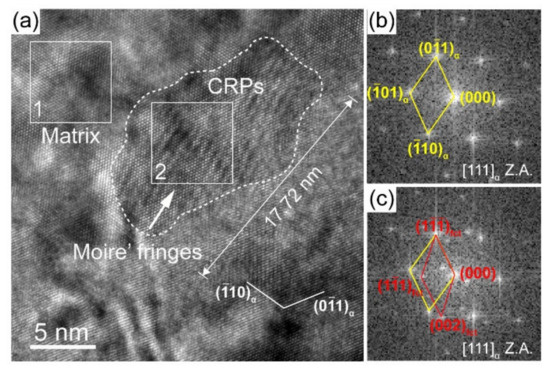 After PWHT at 550 °C for 1 h, superlattice diffraction spots are also found (Figure 12b,e). The dark field micrographs present an increased number density of B2 CRPs in two HAZ subregions (Figure 12c,f), which proves that PWHT is an effective method to promote the reprecipitation of B2 CRPs. Furthermore, bright field observations present large CRPs with a size of ~10 nm and ~24 nm in the partial austenitizing zone (Figure 13 and Figure 14). Many studies have demonstrated that structure evolution is accompanied by coarsening of CRPs: B2 structure (less than 5 nm)→9R structure (4–17 nm)→3R structure (18–40 nm)→FCC structure (>40 nm) [10,28]. Accordingly, CRPs with a size of ~10 nm and ~24 nm might be 9R and 3R incoherent CRPs, respectively. Meanwhile, the EDS results reveal that the increase in Cu content is accompanied by the size increase in CRPs. Figure 15 shows the high-resolution morphology of CRP along the [111]α direction. The CRP exhibits an elongated morphology with a long axis of approximately 17.72 nm. Many moire’ fringes in the CRP are parallel to the [10]α direction. These moire’ fringes are aroused by lattice overlap. Figure 15b and c show Fast Fourier Transforms patterns of the matrix and precipitates, respectively. The patterns and moire’ fringes are effective evidence for the formation of incoherent FCT structure [29].