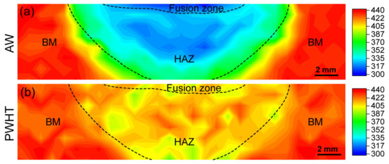 Hardness maps of the (a) AW and (b) PWHT joints.