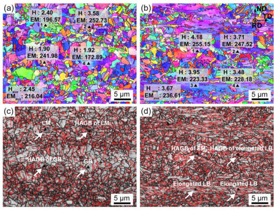 (a,b) EBSD orientation maps labeled with nano-hardness (H) and elastic modulus (EM) and (c,d) image quality maps with HAGBs (black line) and LAGBs (red line) for the AW joint. (a,c) Complete austenitizing zone, (b,d) partial austenitizing zone.