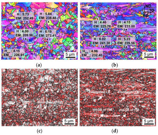 (a,b) EBSD orientation maps labeled with hardness (H) and elastic modulus (EM) and (c,d) image quality maps with HAGBs (black line) and LAGBs (red line) for the PWHT joint. (a,c) Complete austenitizing zone, (b,d) partial austenitizing zone.