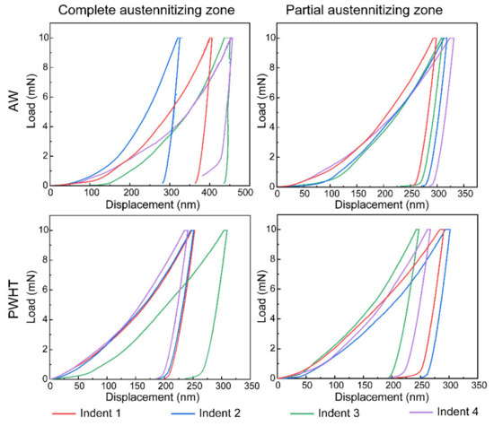 Utilizing the EBSD technique, each indent of the nanoindentation tests is tracked. Micromechanical properties, including the nano-hardness (H) and elastic modulus (EM), are marked in Figure 17 and Figure 18. Figure 19 exhibits the corresponding load-displacement curves of different indents. The shorter displacement means the higher nano-hardness. In the AW joint, the partial austenitizing zone shows higher average values of micromechanical properties (H: ~2.45 GPa, EM: ~216.04) than that of the complete austenitizing zone (H: ~3.67 GPa, EM: 236.61). The difference in nano-hardness is consistent with the conclusion of Vickers hardness testing (Figure 16a). In addition, the nanoindentation test curves of the complete austenitizing zone exhibit a high degree of dispersion (Figure 18), indicating the inhomogeneous mechanical properties of the microstructure for the complete austenitizing zone. For the PWHT joint, the nano-hardness and elastic modulus are improved significantly. The average value of the nano-hardness in the complete austenitizing zone and partial austenitizing zone reaches ~4.15 GPa and ~4.96 GPa, respectively. Notably, the dispersion of the nanoindentation test curves decreases (Figure 19), which implies that the performance uniformity of the complete austenitizing zone is improved. The reasons for micromechanical properties changes are explained in detail as follows.