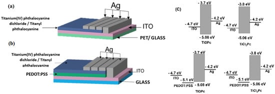 To complement the study on the behavior of phthalocyanine films as an active layer, additional devices were fabricated on glass: ITO/PEDOT:PSS/MPc or ITO/MPc/Ag (see Figure 2b). Energy-level diagrams for the fabricated devices are shown in Figure 2c. The poly(3,4-ethylenedioxythiophene)-poly(styrenesulfonate) (PEDOT:PSS) film was deposited by the spin-coating technique as a hole-transporting layer in Smart Coater 200 equipment (Laurell Technologies Corporation, North Wales, PA, USA). The dispersion used for the manufacture of the films consisted of poly(3,4-ethylenedioxythiophene) polystyrene sulfonate (PEDOT:PSS) in 1.1% in H2O with neutral pH and high-conductivity grade. The dispersion was deposited on the substrate and the equipment was operated at a constant angular speed of 300 rpm during 10 s and an acceleration of 80 rpm/s, then dried at 80 °C for 3 min. After the deposit of PEDOT:PSS, the TiOPc and TiCl2Pc were subsequently deposited by the high-vacuum thermal evaporation technique with the previous deposition parameters and annealed for 2.5 h at 300 °C.