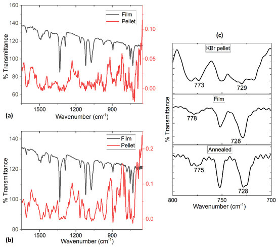 IR spectroscopy was performed for TiOPc and TiCl2Pc, in KBr pellets and in films deposited on a silicon substrate. The above is to establish if any degradation of the material took place during the deposit of the film as a consequence of the Pc sublimation and its subsequent deposition on the substrates. The IR spectroscopy is based on the fact that the Pc bonds have specific vibration frequencies that correspond to the molecule energy levels. In the present study, it is sought that the spectrum of the TiOPc and TiCl2Pc in pellets equals the films spectrum, deposited in silicon. In Figure 3a,b and in Table 1, the values found of the representative vibrations of the TiOPc and TiCl2Pc structures are shown, both in pellets and in thin film: (i) the band responsible for the pyrrole in-plane stretch vibration in the Pc ring is observed around 1587 and 1335 cm−1, (ii) the bands located around 1290, 1166 and 1118 cm−1 are the result of the interaction between C of the peripheral rings, with the hydrogen atoms [], (iii) the band located around 753 cm−1 is the interaction in plane of C-H deformation, and (iv) the bands observed around 1610 and 1475 cm−1 result from a C=C stretching mode [,,,]. From the IR spectroscopy analysis, it can be concluded that the signals are present, so there is no thermal degradation. Additionally, the IR spectra were used to identify the different polymorphs in MPcs [,,]. MPcs can exist in various polymorphic forms identified as α, β, γ, δ, ε, and χ phases with the metastable α phase and stable β phase being the most common [,,,]. The signals are found around 724 cm−1 for the α phase and around 777 cm−1 for the β phase [,,]. In the case of the TiOPc and TiCl2Pc films, the spectrum in KBr displayed the signals of both phases. In the literature, it is mentioned that the phase transition from α to β phase occurs in most metallic phthalocyanine (MPc) films through a temperature exposure from 200 to 300 °C [,,,,]. However, as can be seen in Figure 3c, for the non-planar TiOPc, this transformation did not occur, neither when forming the film nor when performing the annealing. Similar results occurred with TiCl2Pc in KBr pellet and in film form, also after annealing; the α and β phases of the phthalocyanine were maintained. This result is indicative of the high thermal stability of TiOPc and TiCl2Pc. The latter is a high-vacuum evaporation technique that tends to form amorphous films as a consequence of the sublimation and subsequent nucleation and growth process. In the TiOPc and TiCl2Pc films, there were practically no changes in orientation and structure.