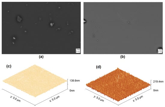 SEM microphotographs of (a) TiOPc and (b) TiCl2Pc films at 5000×. AFM images of (c) TiOPc and (d) TiCl2Pc films.