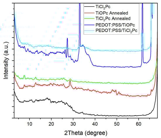 where D is the mean crystallite size of the θ Bragg angle, λ the X-ray wavelength, K the shape factor (~0.89), and β the full width at half maximum (FWHM). Table 3 shows the resulting sizes (~0.2–1 nm), where for the TiCl2Pc film, smaller sizes are presented, supporting the observations in Figure 4. On the other hand, the PEDOT:PSS/TiCl2Pc and PEDOT:PSS/TiOPc devices had very different results. For the PEDOT:PSS/TiOPc, an interesting increase in crystallite size was observed, but for the PEDOT:PSS/TiCl2Pc, an apparent decrease is observed. The latter will affect the optoelectronic properties of the devices compared to the the TiOPc and TiCl2Pc annealed films, resulting from the absorption and charge-carrier transport variation.