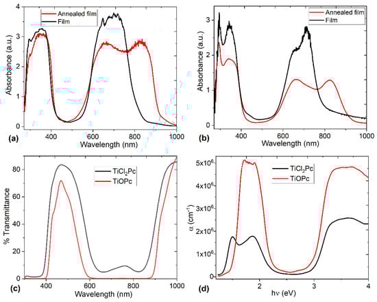 Absorbance spectra of (a) TiOPc and (b) TiCl2Pc films before and after annealing. (c) Transmittance and (d) absorption coefficient of TiOPc and TiCl2Pc films after annealing.