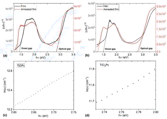 Variation in (αhν)1/2 with hν for (a) TiOPc and (b) TiCl2Pc films before and after annealing. Variation in ln(α) with hν for (c) TiOPc and (d) TiCl2Pc films.