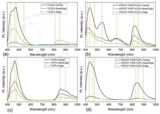 Additionally, photoluminescence (PL) measurements were conducted on the samples and plotted in Figure 8. The PL emitted by the excitation spot on the films appeared as follows: blue green (TiCl2Pc), blue (TiOPc), violet blue (PEDOT:PSS/TiCl2Pc), violet blue (PEDOT:PSS/TiOPc), and with an intensity high enough that was observed with the naked eye. As depicted for all the devices, two main broad bands are observed in the 400–600 nm and 800–950 nm ranges. The measurements were conducted for three locations within the sample to evaluate the homogeneity and PL response: at the sample center, near the edge, and the edge. For all spectra, the sample center presents a higher PL intensity. The spectra for all locations are almost similar for most of the samples, maintaining the emission wavelengths due to homogeneity, but the emission intensities vary according to the location along the sample. The latter is mainly related to the location film thickness and arrangement of the molecules, as a consequence of the deposition process. The emission in the blue region (i.e., 430–550 nm) is present in all spectra and related to the phthalocyanine contribution [,]. For TiCl2Pc (Figure 8a), a maximum emission is observed at 475 nm and for the TiOPc film (Figure 8c) at 460 nm, which is also present for the TiCl2Pc film. On the other hand, a shoulder around 430 nm is observed for both films, but more intense for TiCl2Pc, mainly related to a singlet exciton recombination. Further, a broadening to 600 nm of this emission band is observed like a bandtail for TiCl2Pc. All of this may be related to the ligand coordinated to the tetravalent titanium affecting the number of intrinsic levels on the conduction bands. The emission doublet around 800–950 nm is also related to the phthalocyanine and is affected by the ligand by means of the exciton recombination. The broadening of both intense signals may be related to the formation of delocalized states between HOMO and LUMO, indicative of a non-radiative mechanism. For the PEDOT:PSS/TiCl2Pc (Figure 8b) and PEDOT:PSS/TiOPc films (Figure 8d), a change in the spectra is observed, compared to Figure 8a,c. A blue shift in the maximum emission band to 420 nm is observed. However, a shift to 410 nm is observed in Figure 8b for the near edge and edge locations, influenced more by the PEDOT:PSS due to the film deposition process. The emission bands around 420–450 nm and 760–810 nm are attributed to the PEDOT:PSS [,]. The PEDOT:PSS/TiCl2Pc spectra (Figure 7b) present a second emission band around 550 nm that can be related to the TiCl2Pc, which is more intense in the center location. Although the Q and B bands of phthalocyanine are primarily responsible for PL in films, according to our data, the PL in the films is substantially affected by the intermolecular structure. The smallest optical gap is obtained in the films with PEDOT:PSS and, in this case, the PL is enhanced by the presence of the polymer (Figure 8b,d).