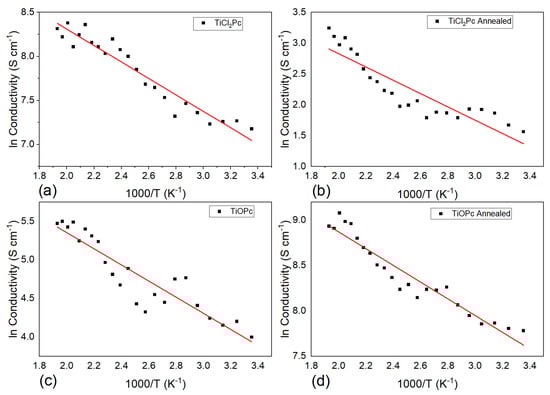 Arrhenius plot of TiCl2Pc and TiOPc before (a,c) and after annealing (b,d), respectively.