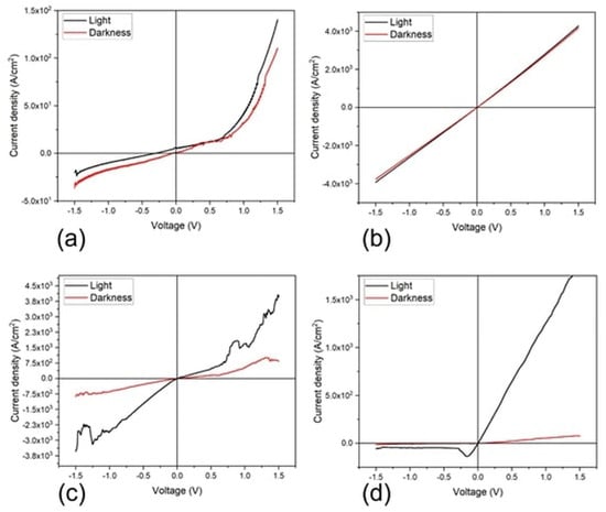 Darkness and illuminated J–V characteristic curve plot of (a) TiCl2Pc and (b) TiOPc and (c,d) with PEDOT:PSS devices, respectively.