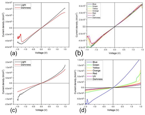 Different light color J–V characteristic curve plot of (a) TiCl2Pc and (b) TiOPc films and (c,d) devices, respectively.