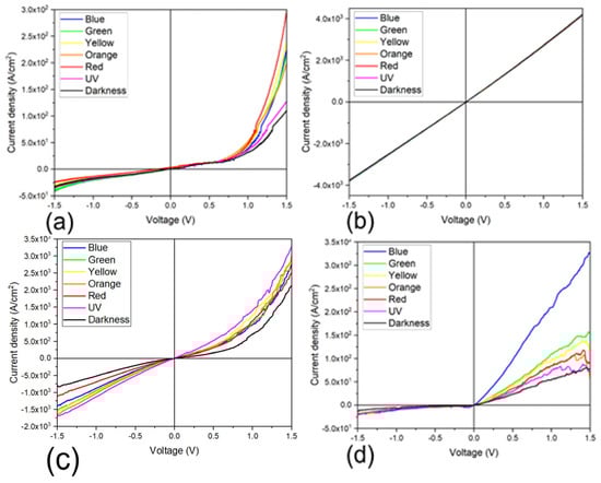 Additionally, the PEDOT:PSS/TiCl2Pc and PEDOT:PSS/TiOPc devices were subjected to thermal annealing and J–V characteristic curves were obtained and plotted in Figure 11. Compared to devices with no annealing, the thermal annealing process increases the current density values, enhancing the conductivity and affecting the photocurrent derived from the illuminated conditions. The curves for darkness and illuminated conditions are not symmetrical and the current density values are larger for the light curves, also indicating that the annealed devices are suitable for optoelectronic applications. For further analysis, the devices were illuminated with different light colors and J–V curves were measured. Figure 11b,d and Figure 12 show the resulting characteristic curves for the different devices, including the darkness curve as a reference. Figure 12a shows the J–V curve for the TiCl2Pc and a marked effect due to the incident light color is observed, where the largest current density value variation is observed for the red light and the least for UV light. Figure 12b shows the J–V curve for the TiOPc and a slight effect due to the incident light color is observed. Figure 12c shows the J–V curve for the PEDOT:PSS/TiCl2Pc and also a marked effect due to the incident light color is observed. However, the largest effect is observed under UV and yellow incident lights. Figure 12d shows the J–V curve for the PEDOT:PSS/TiOPc, with a marked effect due to the incident light color, where the largest photocurrent density is observed for the blue light, while for the UV light, the lowest. However, an apparent increase in the photocurrent with the wavelength is observed, disregarding the UV curve. It is interesting to note that the blue-color curve presents a more pronounced photocurrent, which may indicate that the PEDOT:PSS/TiOPc is more photo-sensitive to this wavelength. For the PEDOT:PSS/TiCl2Pc annealed device (Figure 11b), the incident light effect in the photogenerated current is small but still observable and dependent on the light color. Further, for the PEDOT:PSS/TiOPc annealed device (Figure 10b), an incident light effect is observed, where the largest current density value variation is observed for the blue light and the least for the UV light. An almost direct relation to the wavelength variation is observed by not considering the UV curve.