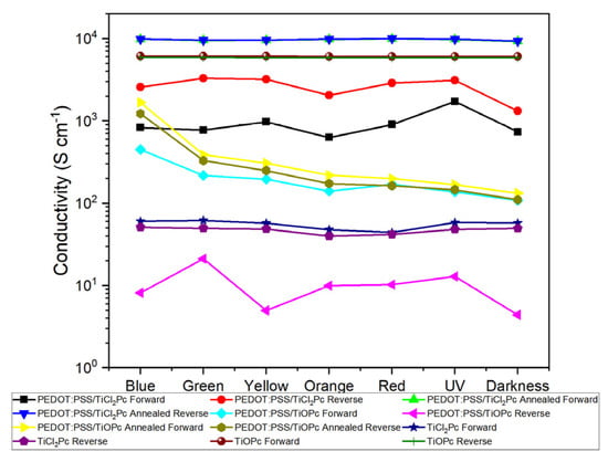 Moreover, the conductivity values on forward and reverse bias were calculated for the devices under different incident light colors, from the J–V characteristic curves, plotted in Figure 13. The obtained conductivity values lay between approximately 10 and 104 S/cm, in good accordance with other Pc results in the literature [,]. It can be observed that depending on the device architecture and annealing, there is a change in the conductivity for forward and reverse bias. This variation may be significant, as for the PEDOT:PSS/TiOPc, and less so for the TiOPc. The greatest forward bias conductivity is observed for the annealed PEDOT:PSS/TiCl2Pc and the smallest for the TiCl2Pc, while for the reverse bias conductivity, the greatest is observed for the annealed PEDOT:PSS-TiCl2Pc and the smallest for the PEDOT:PSS/TiOPc. The effect of the incident light on the conductivity shown in Figure 13 indicates that some of the devices have no variation, whereas other devices are more affected and, in some cases, present a tendency, as for annealed PEDOT:PSS/TiOPc.
