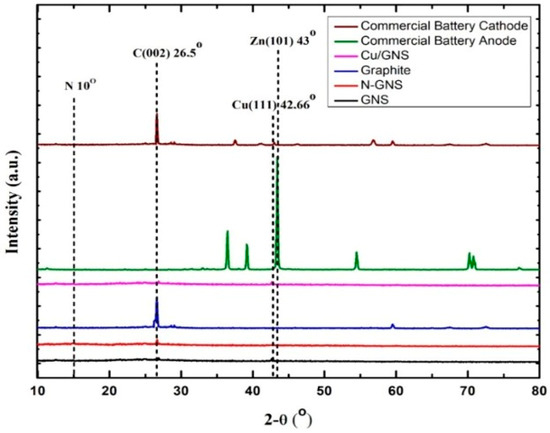 Figure 1 shows the XRD diffraction pattern of the commercial primary battery anode (zinc plate); there is a sharp, tight peak at 2θ = 43°, indicating that the Zn metal (101) is the main component of the commercial primary battery anode. In the cathode of the commercial primary batteries, the diffractogram is similar to graphite. In the XRD diffraction pattern of the Cu/GNS prototype anode, there is a weak and narrow peak at 2θ = 42.66°, indicating that the Cu atom (111) is well deposited in the GNS [30].