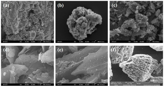 SEM images of (a) commercial battery anode, (b) commercial battery cathode, (c) Cu/GNS, (d) Graphite, (e) GNS, and (f) N—GNS.
