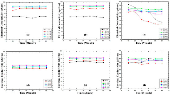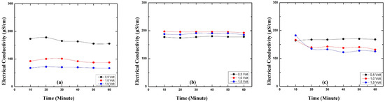 The electrical conductivity numbers of graphite measured at 5–30 V have a stable electrical conductivity (Figure 3d). Interestingly, the electrical conductivity of the GNS and N—GNS are higher compared to graphite (Figure 3e,f). In addition, the GNS may affect the electrical conductivity of Cu on Cu/GNS (Figure 3c). Unfortunately, the GNS, N—GNS, and Cu/GNS have the lower electrical conductivity values among both commercial electrodes.