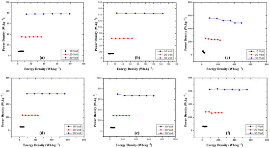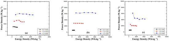 The power density vs. energy density data show the ratio of stored energy and the transfer of the energy rate in the material (Figure 4).