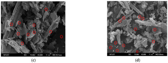 The particle size of Cu was estimated by SEM. The particle size distribution of Cu is shown in Figure 7 for the Cu/GNS prepared with the different material types of the cathode on the primary battery prototype. The mean sizes of Cu were estimated by analyzing a few randomly chosen areas containing 250 particles (white spot in red circle) (Figure 5a–d) in magnified SEM images. Then, the SEM images were calculated and analyzed with the histogram. Finally, we summarized them in Figure 7. It is found that the Cu particles were well dispersed on the GNS. The average diameters of Cu were 0.43–0.58 µm for the Cu/GNS catalyst prepared at different cathode materials (Graphite, GNS, and N—GNS). This method was referred to in our previous study [20].