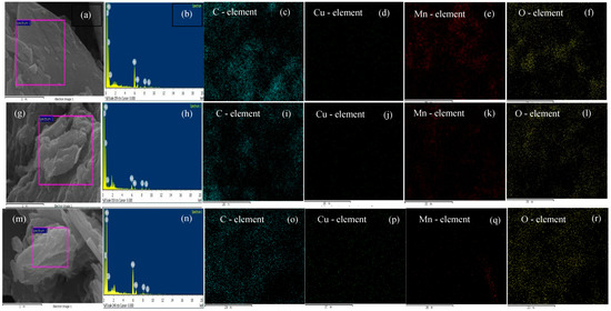 SEM image, EDX graph, C element mapping, Cu element mapping, Mn element mapping, and O element mapping from Cu/GNS//Electrolyte//Graphite (a–f), Cu/GNS//Electrolyte//GNS (g–l), and Cu/GNS//Electrolyte//N—Graphene (m–r).