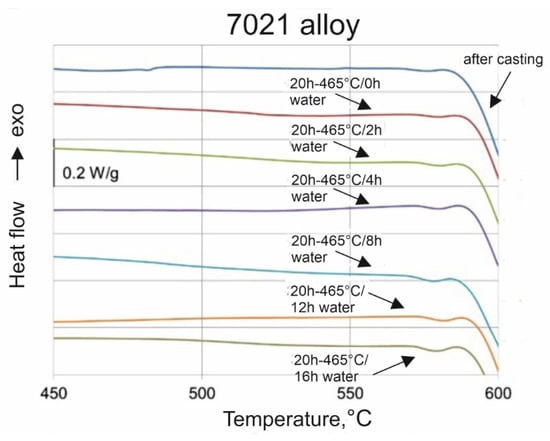 DSC curves for 7021 alloy after homogenization in different conditions.
