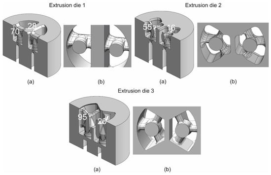 The massive bridges were assumed for die 1 and adapted for hard 7xxx alloys; the thickness of bridges for die 3 was increased by 4 mm, whereas their length was increased by 40 mm in relation to die 2. In addition, a radial and convex entry to cavity of die 3 was added. The thickness of bridges was equal to 28, 16 and 20 mm for die 1, die 2 and die 3, respectively; length of bridges was 70, 55 and 95 mm, whereas height of the welding chambers was 25, 30 and 27 mm. The maximal broad inlet channels, shaped pockets, bearings of varied length and proper geometry of the central baffle and mandrels were adapted for die 3. The 3D models of the porthole dies discussed and the view from the bottom are presented in Figure 2a,b.