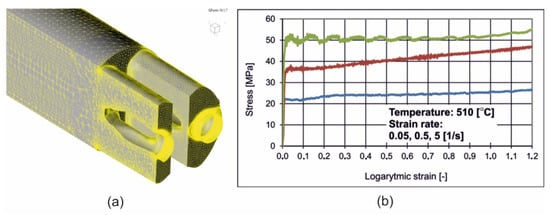 The geometrical model of extruded material with mesh elements (a) and determined material model for FEM calculations—dependence of flow stress vs. logarithmic strain for different strain rates for alloy 7021 (b): blue colour for 0.05 1/s, red colour for 0.5 1/s and green colour for 5 1/s.