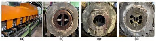 The 25 MN 7 inch extrusion press run-out table (a) and different extrusion porthole dies: extrusion die 1 (b), extrusion die 2 (c) and extrusion die 3 (d)—designed for 2-hole extrusion tests of tubes of Ø50 × 2 mm from 7021 alloy in industrial conditions.