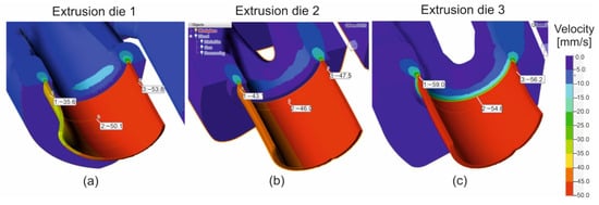 Distribution of metal velocity during extrusion of tubes of Ø50 × 2 mm from 7021 aluminium alloy through porthole dies of different geometry—die 1 (a), die 2 (b) and die 3 (c).
