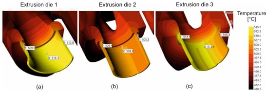 Figure 7 presents the distribution of temperature of the metal during extrusion for the design 1 of die (Figure 7a—on the left), design 2 (Figure 7b—in the middle) and design 3 (Figure 7c—on the right). The higher values of metal temperature of about 9–10 °C were predicted in the case of die 1 and die 3 (516.1 °C and 514.1 °C, in relation to 505.2 °C). The reason for this can be because of the existence of some higher mean velocities of particles and the higher extent of plastic deformation and its conversion into heat.