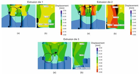 Figure 9 presents the distribution of elastic deflection of the porthole die in the Z direction, particularly within the regions of the mandrel and the die land for all the die geometrical solutions. Coloured maps indicate that the highest dimensional deviations of the mandrel were made in the case of die 2, where an elastic deflection of 0.66 ÷ 0.80 mm was predicted within the area of the die land. In the corresponding area for die 1, the mandrel deflection was much lower and kept itself within the range 0.51 ÷ 0.55 mm. The lowest mandrel deflection of 0.37 ÷ 0.48 mm was predicted for die 3, depending on the mandrel position.