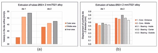 Diagrams of the metal velocity in the die cavity during extrusion of tubes of Ø50 × 2 mm from 7021 aluminium alloy through porthole dies of different geometry (a) and porthole die deflection in Z direction in different areas of mandrel for different die geometry (b).
