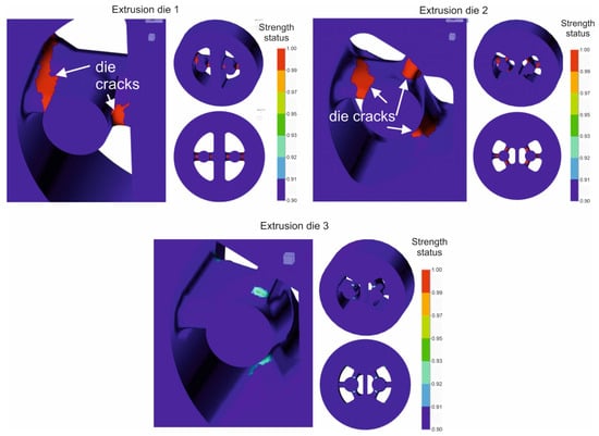 Figure 11 presents the distributions of predicted indicator of the strength status for the porthole dies of different geometry. The indicator of the strength status—red area of the scale—means a high risk of cracking or even mechanical tearing of the die. The maximal values of the indicator for die 1 and die 2 occur in the region of mandrel tops. The significant improvement in the strength conditions in case of die 3 is observed as a result of the elimination of dangerous areas of the bridge arms and the mandrels. For die 3, the indicator of strength status is placed within the range of 0.92–0.95. These benefits result from appropriate changes in the design of the porthole die, i.e., the geometry of the inlet channels, bridges and mandrels.
