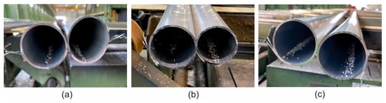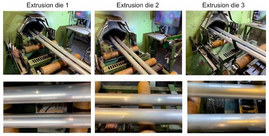 The extrusion of the examined tubes was performed for die 1, die 2 and die 3 for variable heating temperatures of billet: 520 °C, 510 °C, 500 °C and 480 °C and for variable extrusion speed: 1.5 ÷ 4 mm/s. In the case of die 3, the billet temperature was of 480 °C and the extrusion speed was of 1.5 mm/s. Figure 12 presents the tubes on the run-out of the press extruded by using different porthole dies. In general, for the all tested dies, high geometrical stability of the tubes and high quality of the tubes surface, free of tarnish and cracks, can be noticed. The extrusion pressure of 80–90% of the press capacity and exit speed from dies of 4.5 m/min (for die 1), 3.5 m/min (for die 2) and 4.5 m/min (for die 3) were recorded using a data acquisition system. The tubes of Ø50 × 2 mm, extruded from 7021 alloy in cross-section by using different dies, are presented in Figure 13.