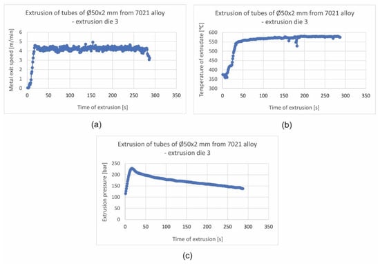 Recorded technological parameters of extrusion of tubes of Ø50 × 2 mm from 7021 alloy for extrusion die 3: metal exit speed (a), extrudates temperature (b) and extrusion pressure (c).