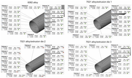 Figure 16 and Figure 17 present the results of the optical scanning with the use of a ATOS Core 200 system, purchased from the GOM Company, for tubes of Ø50 × 2 mm extruded from 7021 alloy through the porthole dies: 1, 2 and 3 and, for comparison, through the tubes of identical geometry from 6082 alloy extruded through the classic porthole die for 6xxx series alloys. Figure 16 refers to the measurements of wall thickness in 16 points along the perimeter of the tube, whereas Figure 16 shows the measurement results of the inner diameter of the tube and deviations from the circularity in six points along the perimeter of the tube. The figures also present results of the inspection of the dimensional accuracy of the wall thickness, inner diameter and circularity of the extruded tubes in comparison with permissible deviations from the nominal dimensions described in the standard. The green colour means that a given dimension fits permissible limits in the standard, the yellow colour means that a dimension is placed on the edge of the standard and the red colour means that the dimension is out of the standard.
