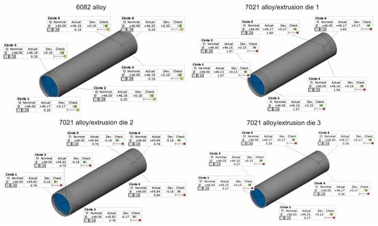 Results of optical scanning of the tubes of Ø50 × 2 mm: measured inner diameter and roundness deviations of tubes extruded from 6082 alloy by using 4-hole die (on the top left) and extruded from 7021 alloy by using 2-hole die 1 (on the top right), 2-hole die 2 (on the bottom left), as well as extruded from 7021 alloy by using 2-hole die 3 (on the bottom right).