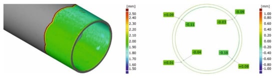 Results of optical scanning of the tubes of Ø50 × 2 mm from 6082 alloy: coloured maps of deviations for 6082 alloy using a 4-hole die (wall thickness on the left and roundness/circularity deviations on the right).