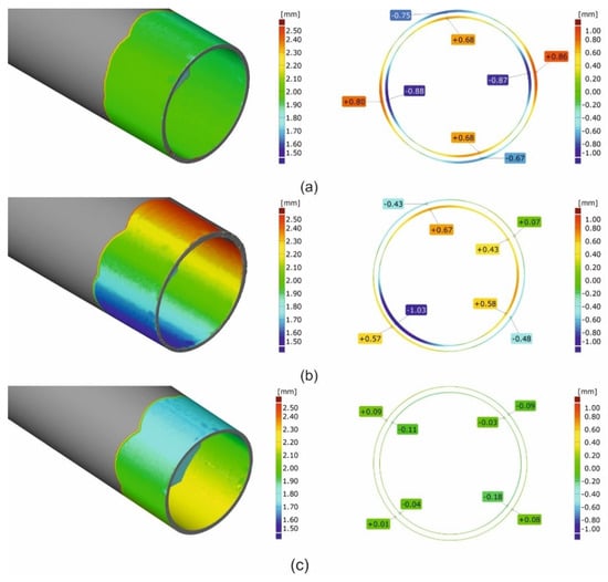 Results of optical scanning of the tubes of Ø50 × 2 mm: coloured maps of deviations for tubes extruded from 7021 alloy with using 2-hole die 1 (a), 2-hole die 2 (b) and 2-hole die 3 (c) (wall thickness on the left and roundness deviations on the right).