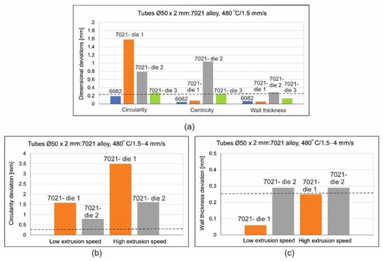 The influence of extrusion speed on the level of circularity deviation for die 2, which rises from 0.8 mm up to nearly 1.5 mm (as extrusion speed changes within the range of 1.5 ÷ 4 mm/s), is also significant. Regarding the eccentricity of the tube in the case of die 1, a low acceptable value is observed even for high extrusion speeds. However, a large value of eccentricity for the tube of die 2 is observed (over 1 mm) for a low extrusion speed of 1 mm/s, which unexpectedly drops twice for high extrusion, with a speed of 4 mm/s. As reported before, a small deviation of the wall thickness below 0.1 mm for die 1 and a low extrusion speed of 1.5 mm/s occurred, whereas for a high extrusion speed of 4 mm/s the deviation slightly exceeds the permissible value of ±0.25 mm. In the case of die 2, a large deviation of the wall thickness, exceeding the acceptable limit is observed, independently of the extrusion speed (Figure 20). Die 3 provided the lowest and most acceptable geometrical deviations of extruded tubes from the 7021 alloy.