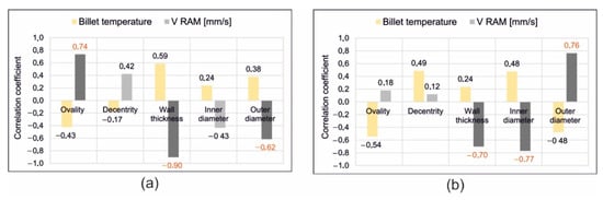 Based on the analysis results, a correlation coefficient was established. In particular, a coefficient from 0.6 to 1.0 (high, very high and full correlation) was taken into consideration. The significant coefficients of correlation were indicated in red in Figure 21. A strong correlation of variables, such as extrusion speed, circularity, wall thickness, inner diameter, and outer diameter of a tube, and a moderate correlation of variables, such as billet temperature and centricity, was found. In particular, for die 1 a high correlation of extrusion speed and centricity of the tube (coefficient of 0.74) was obtained, which means that the rise in extrusion speed within the range of 1–4 mm/s leads to high increase in the tube centricity. In turn, a very high negative correlation between extrusion speed and wall thickness (−0.90), as well as between outer diameter (−0.62), indicates that the increase in the extrusion speed leads to significant decreasing of both wall thickness and outer diameter of the tube. The rise in temperature moderately influences the decrease in centricity of the tube (correlation coefficient of −0.43).