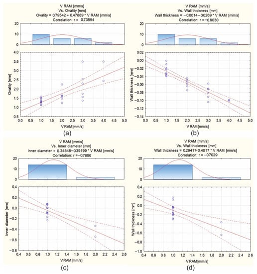 Figure 22 presents the scatter diagrams of results for the tube extrusion of Ø50 × 2 mm from 7021 alloy through die 1 (Figure 22a,b; correlation of extrusion speed and ovality, as well as wall thickness) and through die 2 (Figure 22c,d; correlation of extrusion speed and inner diameter, as well as thickness of the tube).