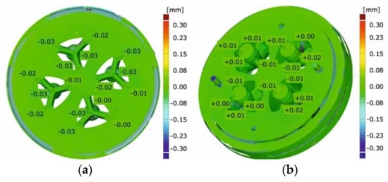 Results of optical scanning of the porthole dies for extrusion of tubes of Ø50 × 2 mm from 6082 alloy: die deflection—bridges view (a) and the mandrels (b).