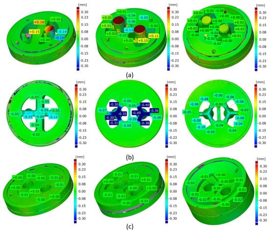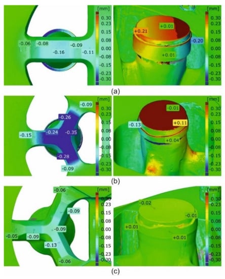 Results of optical scanning of the porthole dies for extrusion of tubes of Ø50 × 2 mm from 7021 alloy: die deflection for mandrels (a), bridges (b) and inserts (c)—die 1 (on the left), die 2 (in the middle) and die 3 (on the right).
