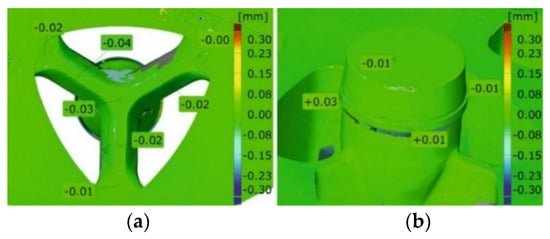 In the case of the insert-part of die 2 (H90227), two areas were marked and analysed. Areas 1–4 indicate deviations obtained from the side surface of channels in the die insert, whereas areas 5–8 relate to quantities obtained from the die land surface (Figure 28b). The results indicate small dimensional deviations at a level of 0.07 mm, whereas the largest differences occur in the case of the side surface of the channel in comparison to the die land values.