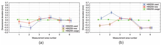In the case of the insert-part of die 1 (H90259), three crucial areas were analysed. Areas 1–2 indicate the frontal part of the channel, 3–4 the side surface of the channel and areas 5–6 relate to the die land. In the case of this element, the highest deviation values, at a maximum level of −0.3 mm, occur for the areas 5–6 (Figure 27b). The obtained values result from insufficient precision in the workmanship of the element, since the diagram representing wear indicates small deviations from the nominal value.