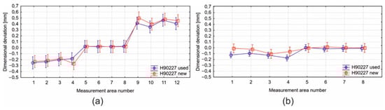 Three regions for each die aperture were marked in the case of the bridge-part of die 2 (H90227). The area marked with 1–4 means the dimensional deviations of the channel surface, 5–8 refers to deviations from the surface of the core land and 9–12 are related to the frontal surface of the bridge (Figure 28a). The highest deviations, at the level of −0.45 mm for the new die and −0.40 mm for the used die, occur for the area 9–12, which means that these regions seem most exposed to wear.
