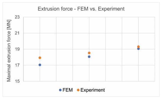 Comparison of extrusion force for the analysed tube from 7021 alloy—FEM predicted and experimentally validated.