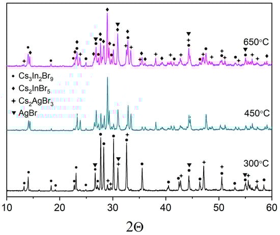 According to the phase XRD analysis performed (Figure 2), the Cs2AgInBr6 phase was not formed, but the sample ‘1’, annealed at 300 °C included two phases of binary bromides Cs3In2Br9, Cs2AgBr3. Samples ‘1’, annealed at 450 and 650 °C include the phases Cs3In2Br9, Cs2AgBr3, and Cs2InBr5. Additionally, some reflections of the AgBr phase would be found, which are not unique only for this phase but overlap with the reflections of the phases of binary bromides, namely, Cs3In2Br9 and Cs2AgBr3.