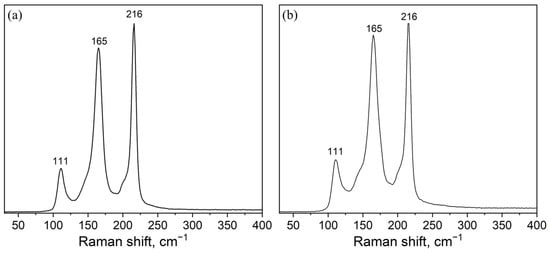 The Raman spectra were studied on an InVia Raman Microscope spectrometer (Renishaw, New Mills, UK) equipped with an argon laser with a wavelength of 532 nm and a helium-neon (He-Ne) laser with a power of 20 mW with a wavelength of 632.8 nm and a spectral filter (5% of the total intensity). All spectra were obtained using a 50× objective by 100-fold signal accumulation, excitation time 1 s. A plate of (100)-oriented single-crystal silicon with a characteristic Raman mode of 521.5 cm−1 served as a standard sample for the preliminary calibration of the device.